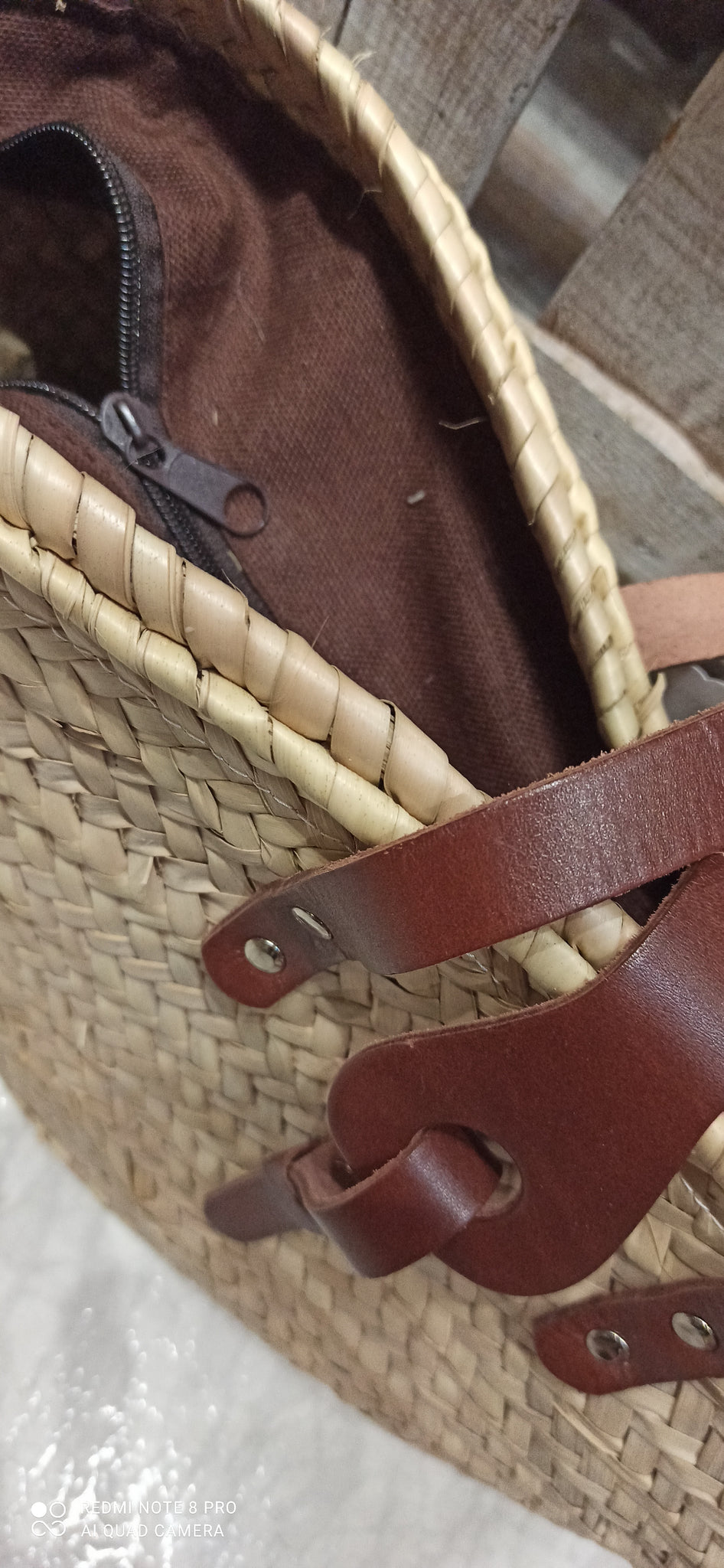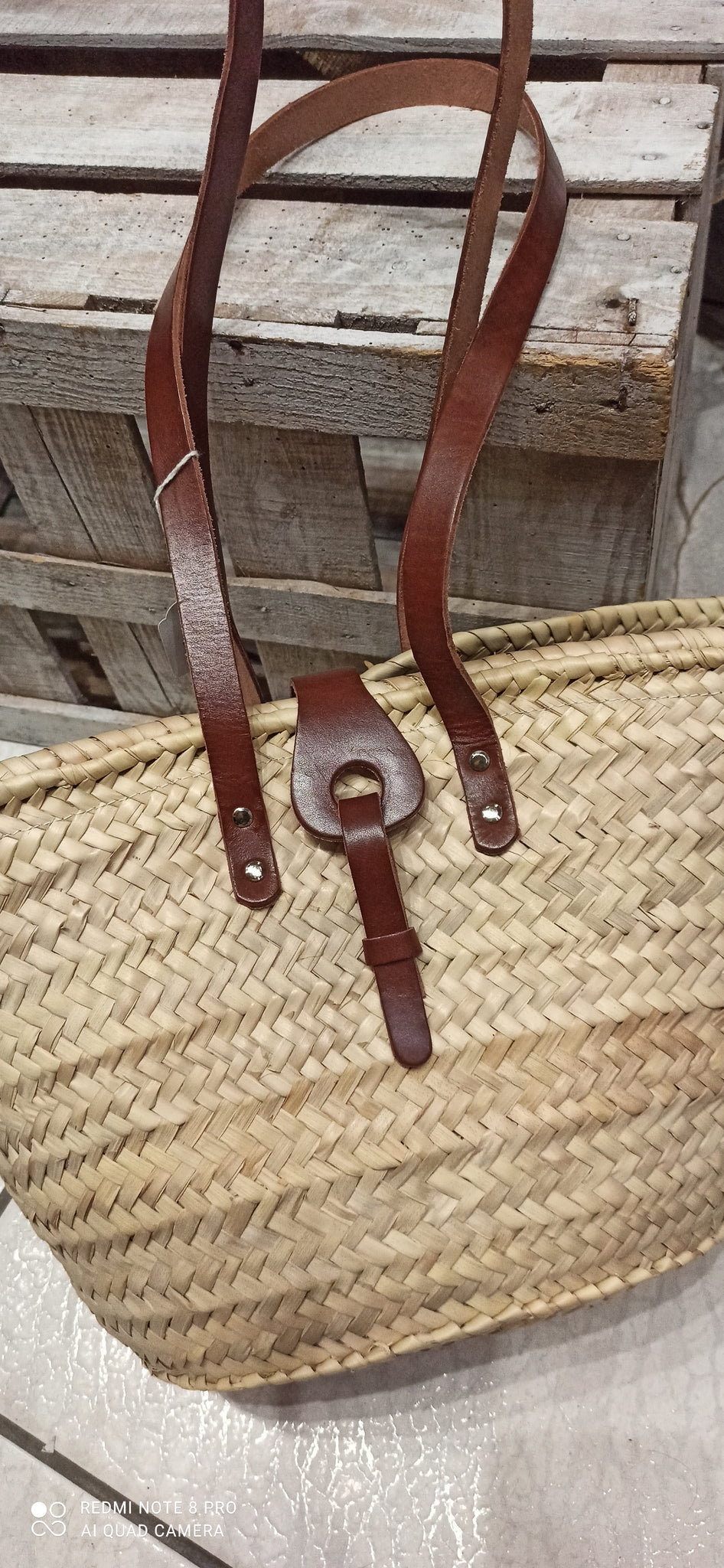 Capazo para playa de Palma, con decoración a un lado de una estrella lentejuelas fucsia, medida mediana, con dos asas de cuero, forrado en algodón y cierre con cordón.